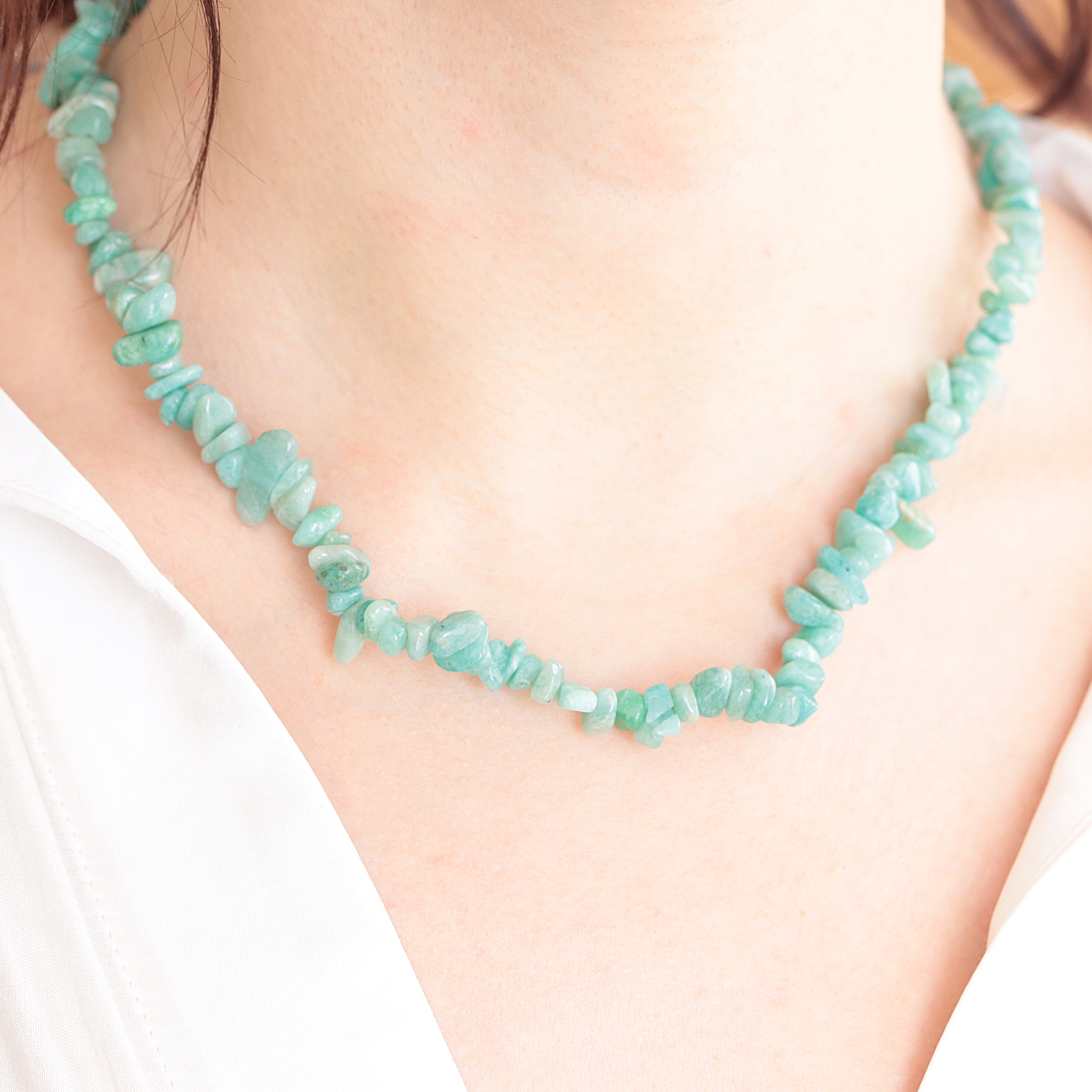 Naszyjnik z naturalnego amaznitu na żyłce z metalowym zapięciem na karabińczyk. Wykonany z sieczki kryształowej, czyli drobnych, polerowanych kamyczków. Przybliżona długość wraz z zapięciem to ok. 45 cm. Do naszyjnika można dobrać pasującą kryształową bransoletkę, tworząc harmonijny zestaw.