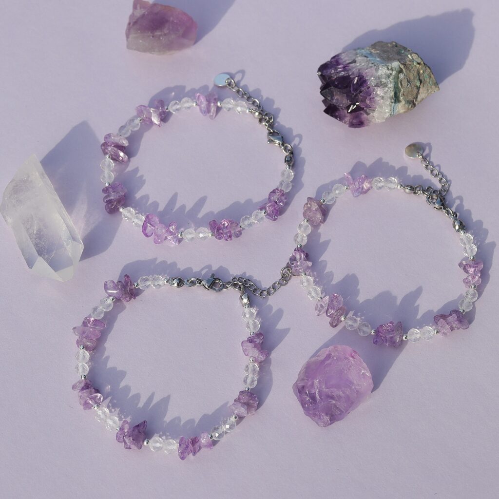 💎 Każda bransoletka jest tworzona ręcznie, co nadaje jej całkowicie niepowtarzalny charakter. Ze względu na specyfikę materiałów oraz rzemieślnicze wykonanie, poszczególne egzemplarze mogą się od siebie subtelnie różnić. W Twojej bransoletce możesz znaleźć nieco więcej drobnych kamieni ametystu – dodajemy ich tyle, by zachować idealną estetykę i ciągłość wzoru. Dzięki temu masz pewność, że Twoja biżuteria jest jedyna w swoim rodzaju.