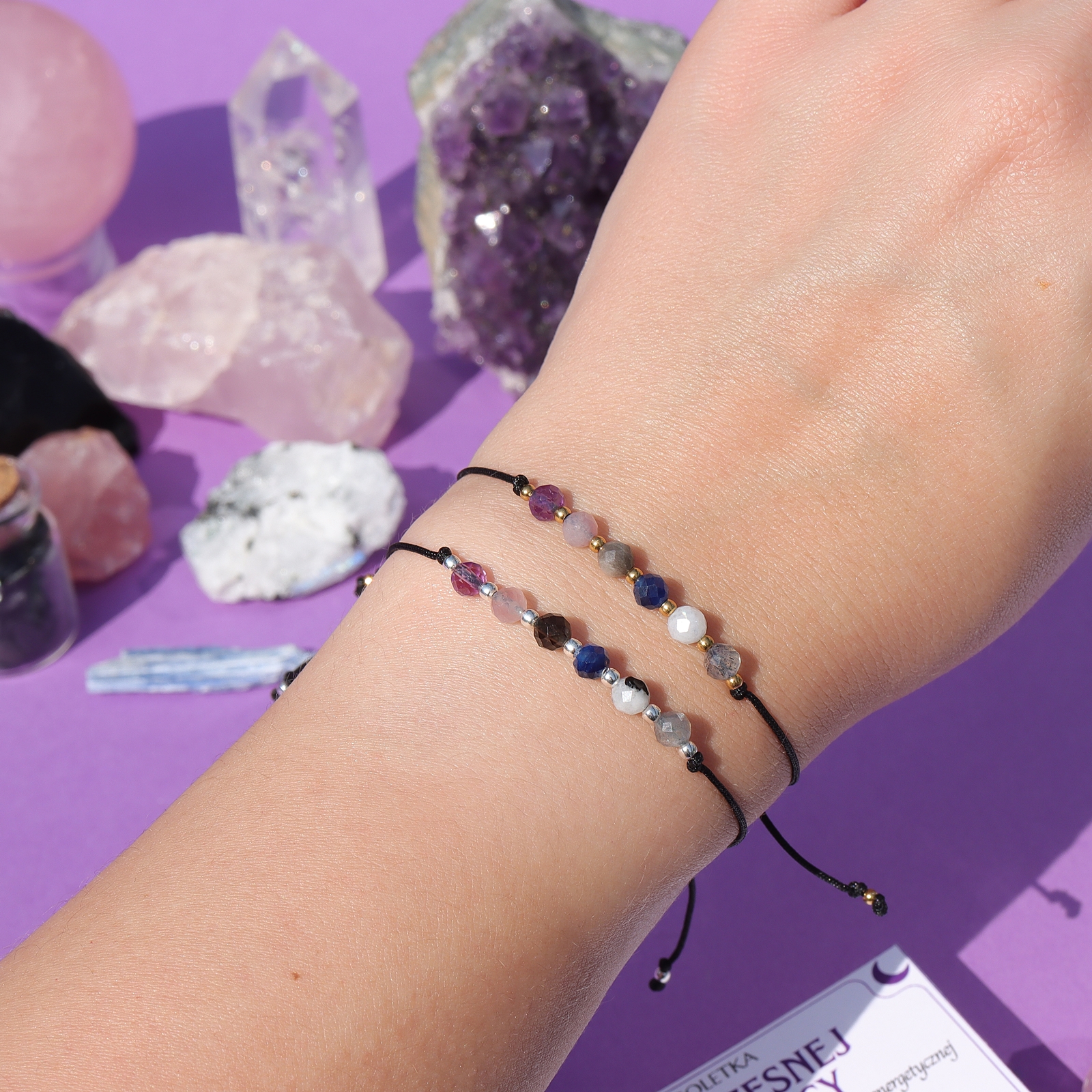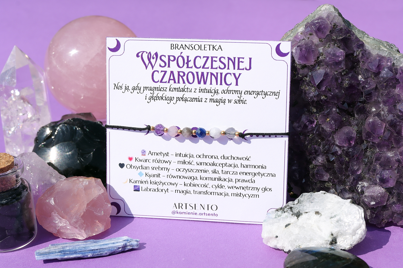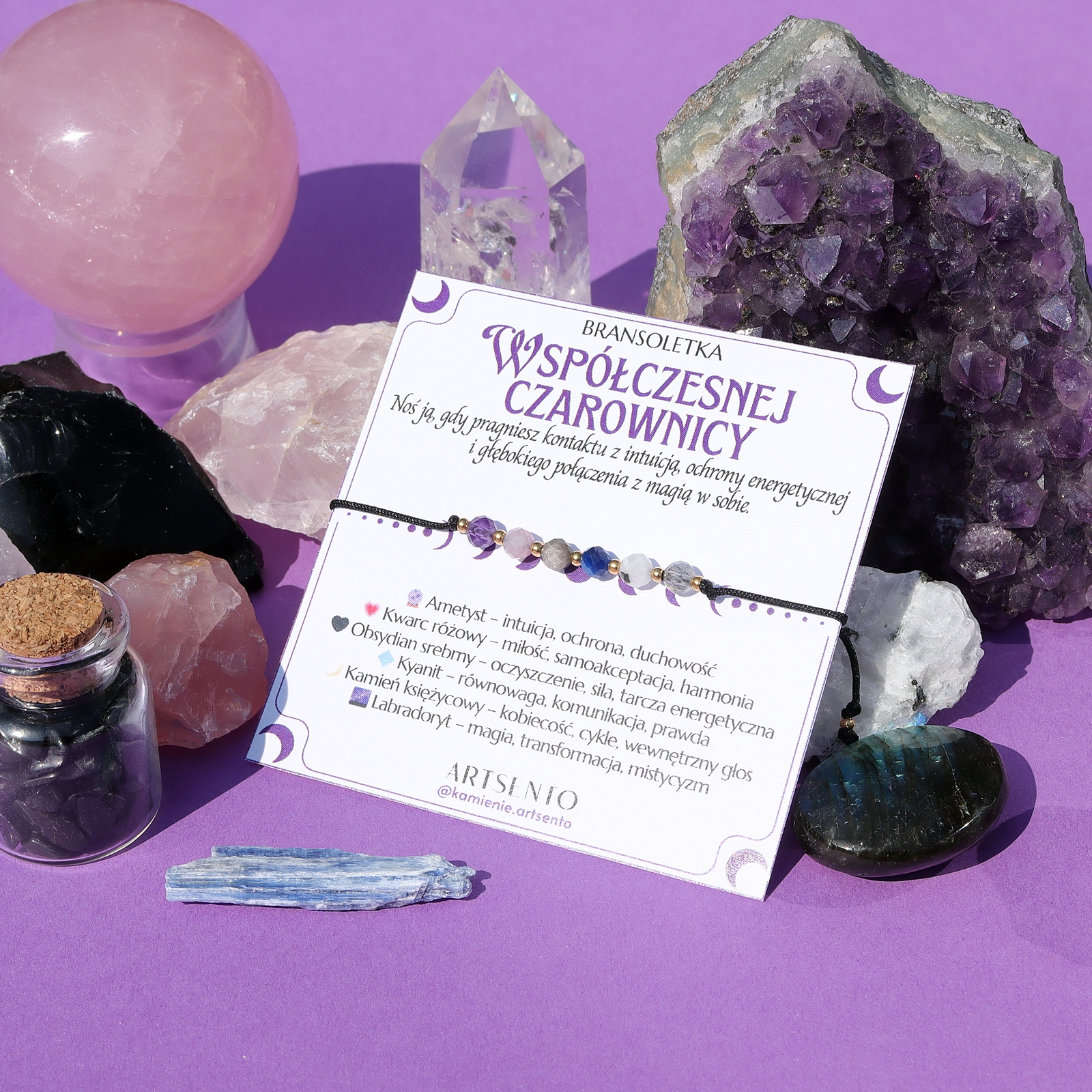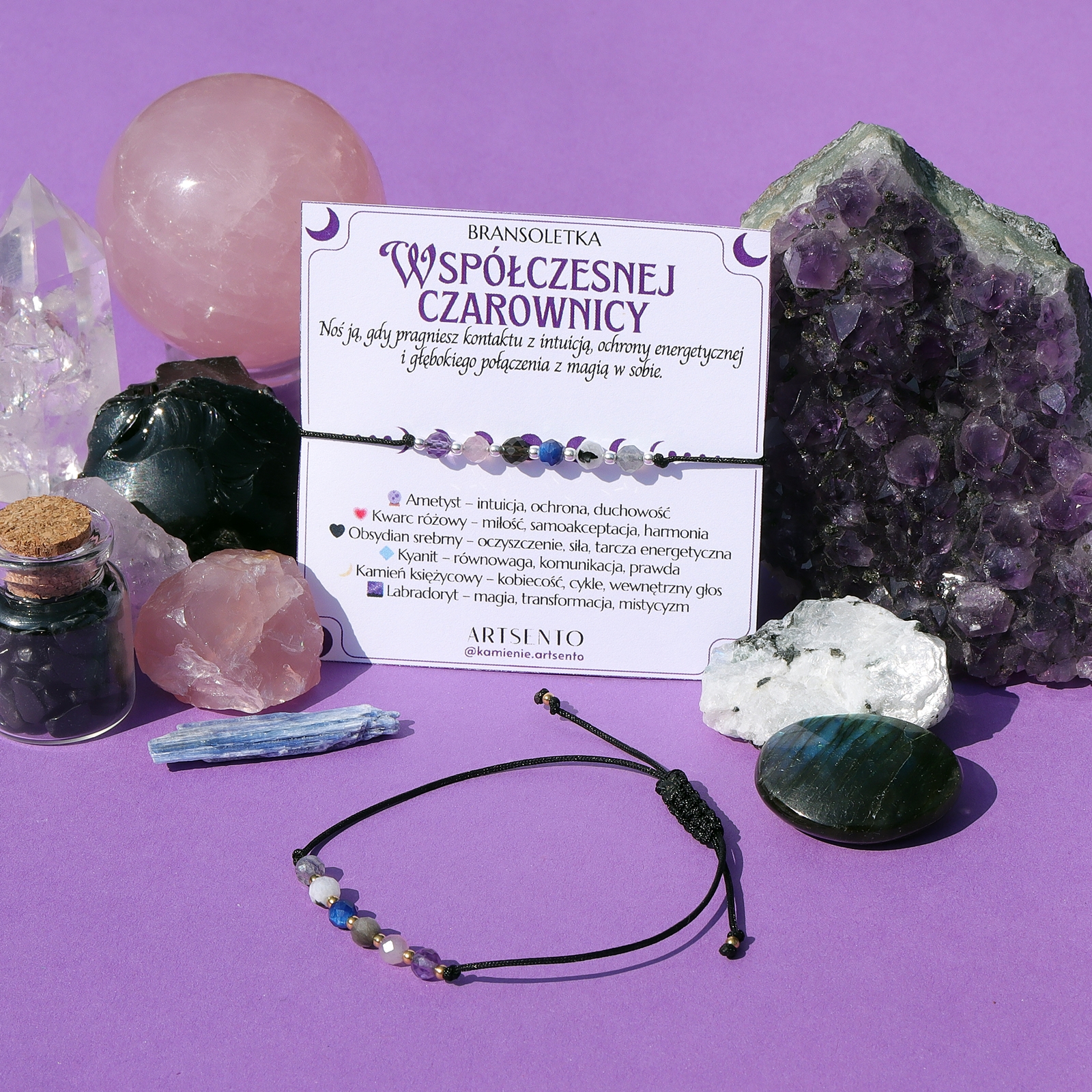 ✨ Ametyst – ochrona duchowa i rozwój intuicji ? Kwarc różowy – energia miłości i harmonii ? Obsydian czarny – tarcza ochronna przed złą energią ? Labradoryt – kamień magii, transformacji i wewnętrznej siły ? Kyanit – równowaga czakr i moc komunikacji ? Kamień księżycowy – intuicja, kobiecość i połączenie z energią Księżyca