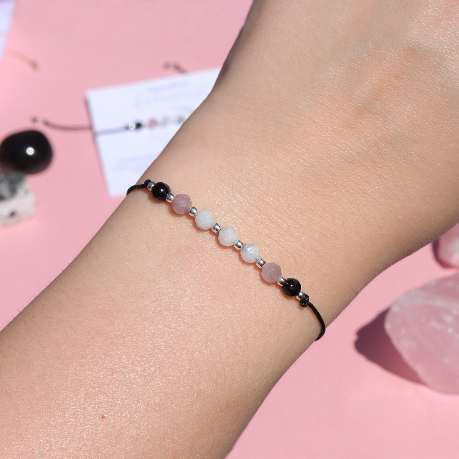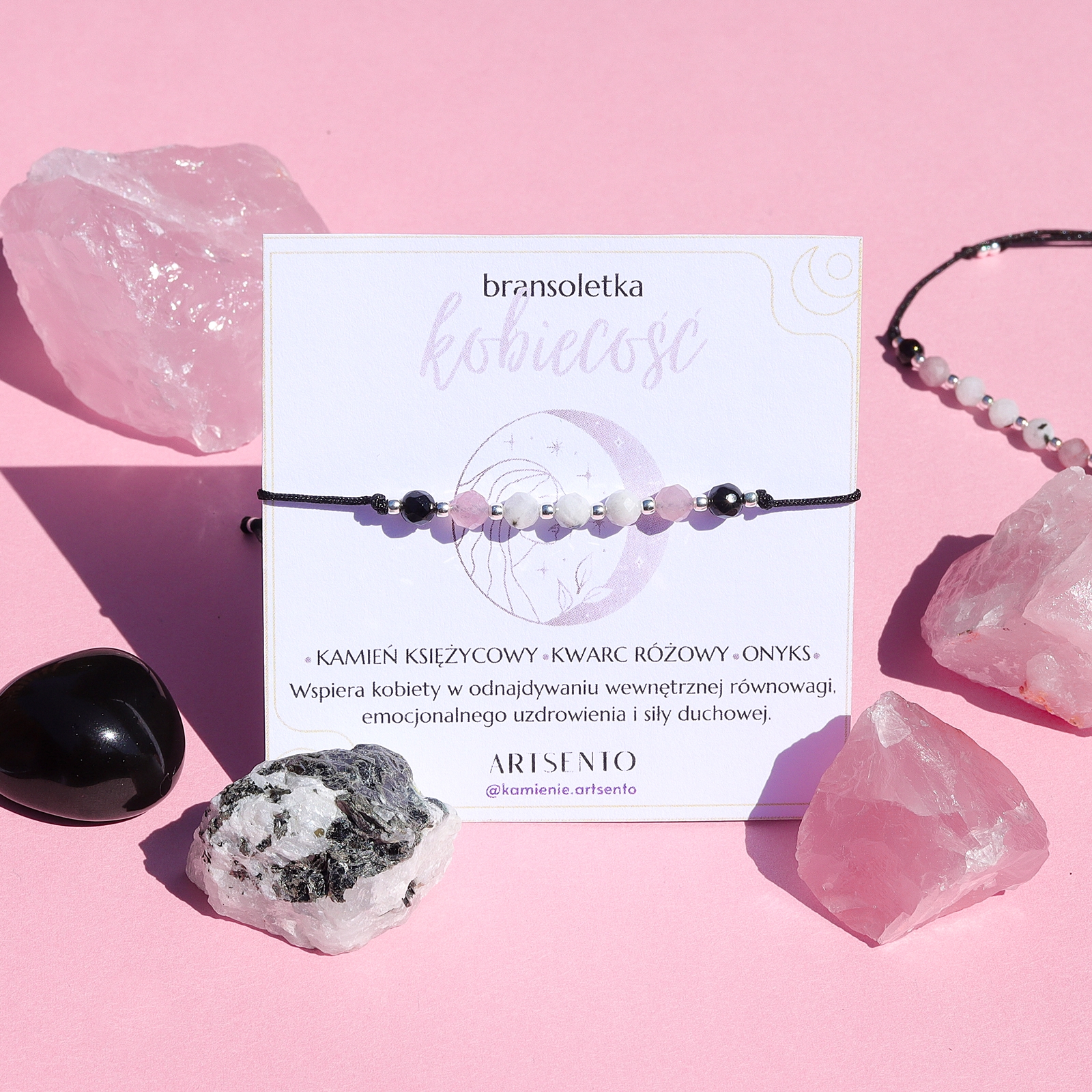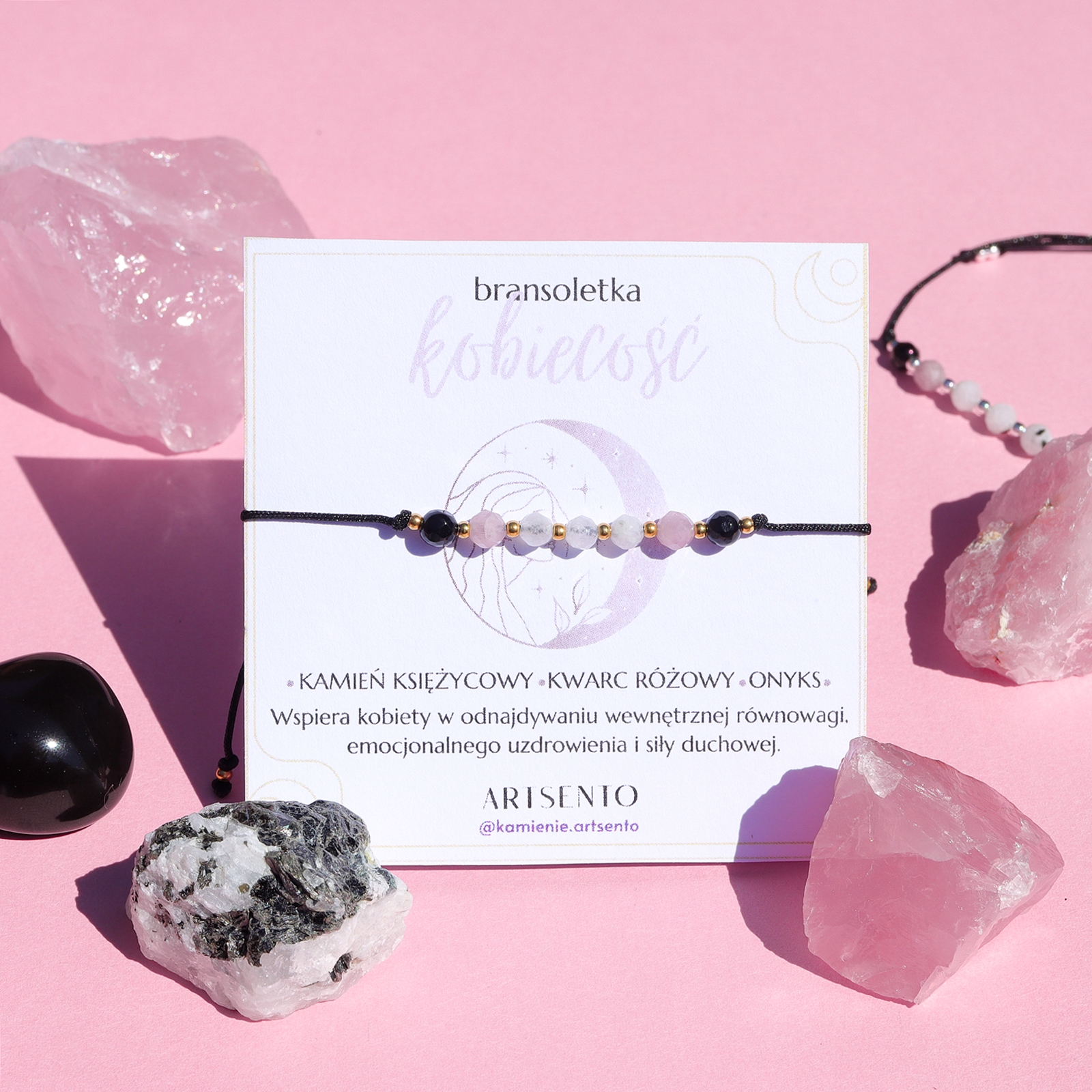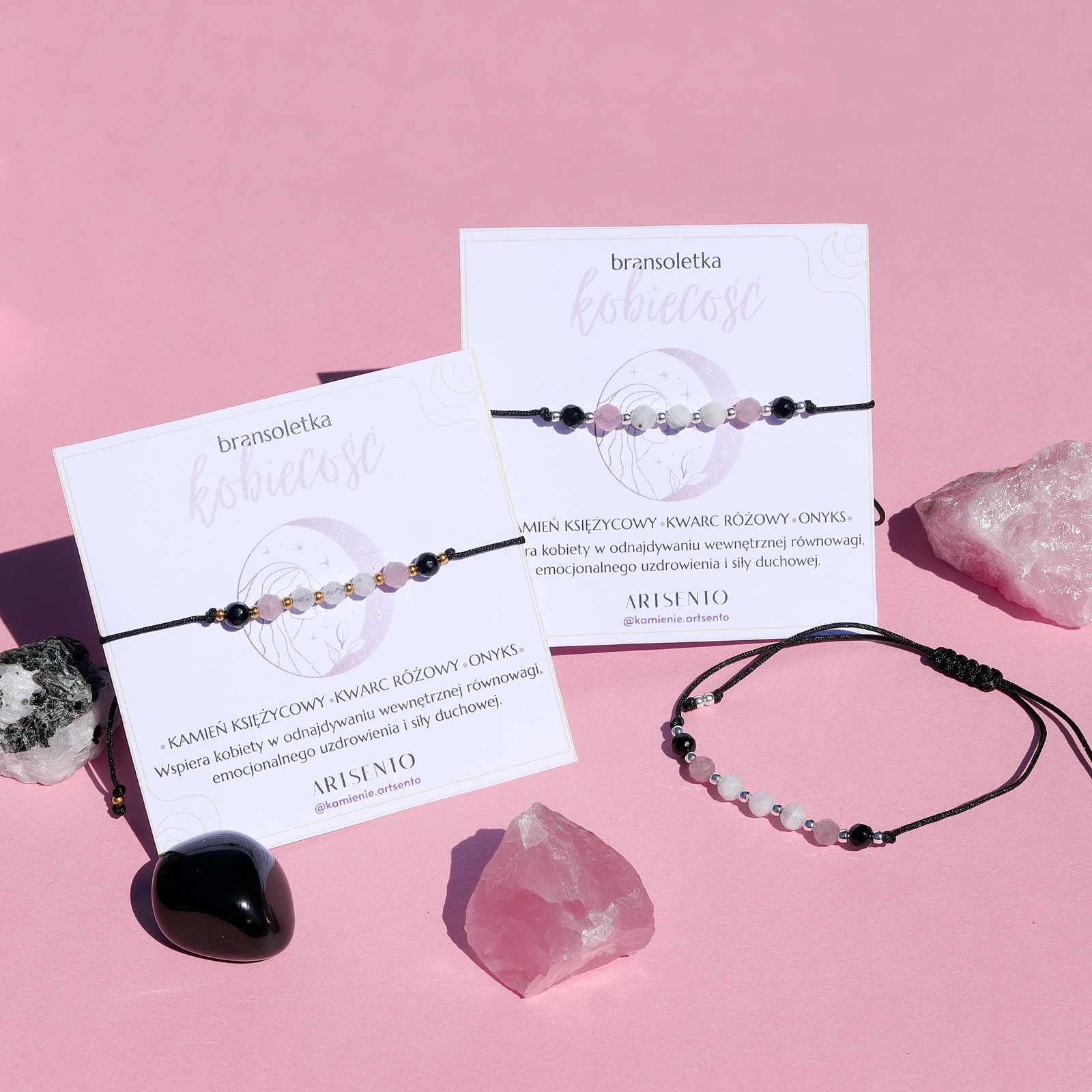 Odkryj moc harmonii, równowagi i kobiecej siły z naszą wyjątkową bransoletką, stworzoną z myślą o wzmocnieniu Twojej wewnętrznej energii. Połączenie trzech wyjątkowych kamieni szlachetnych – kwarcu różowego, kamienia księżycowego i onyksu – sprawia, że ta bransoletka staje się nie tylko modnym dodatkiem, ale również narzędziem do pracy z własnym wnętrzem.?♀️ ?