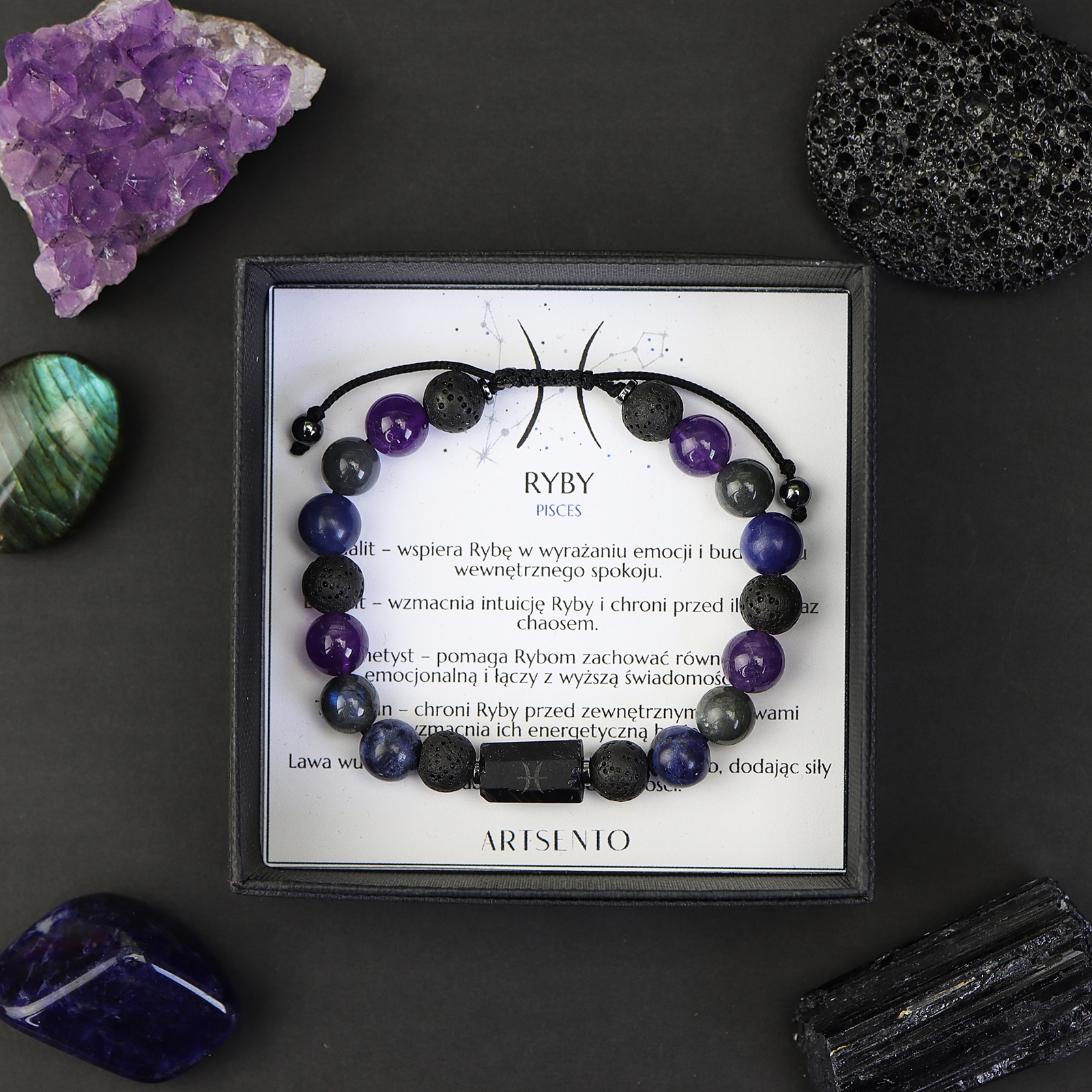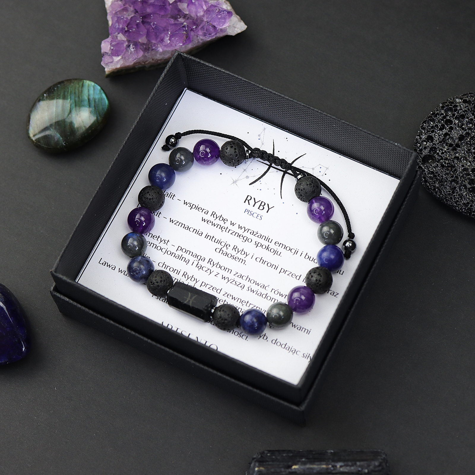 Bransoletka zodiakalna RYBY to wyjątkowa propozycja dla mężczyzn, którzy cenią intuicję, spokój i duchową głębię. Zaprojektowaliśmy ją z myślą o energii Ryb – z kamieni, które wspierają wewnętrzną równowagę i wrażliwość. Grawerowany znak zodiaku dodaje osobistego znaczenia.