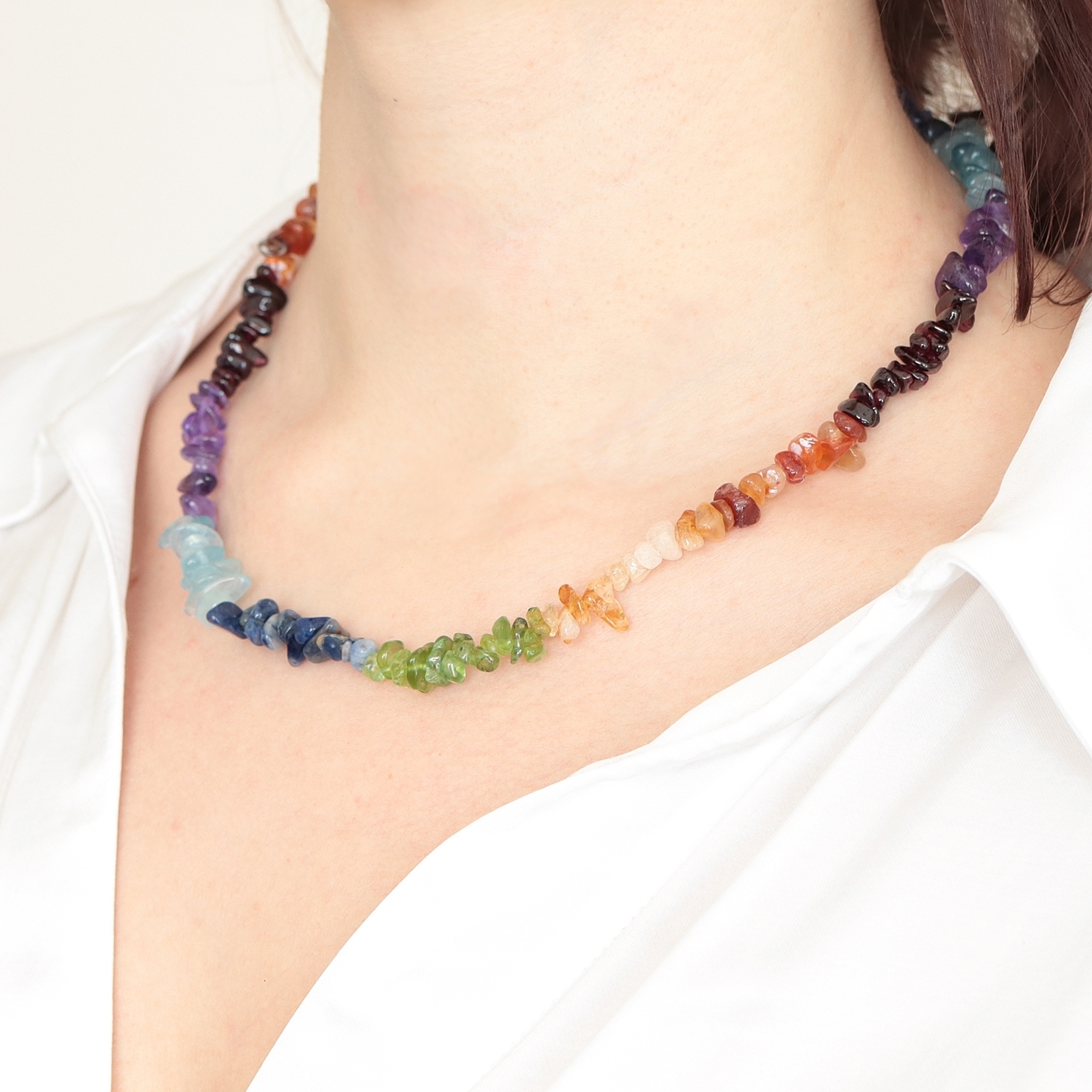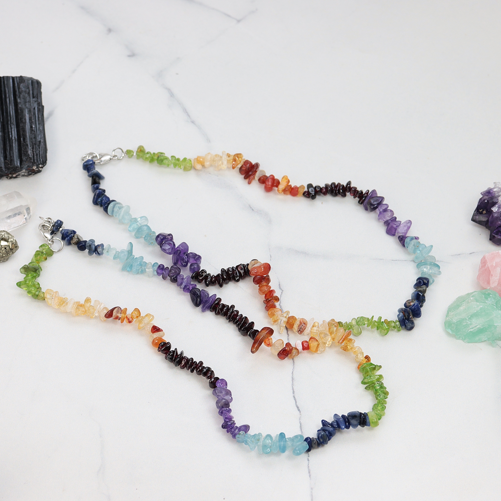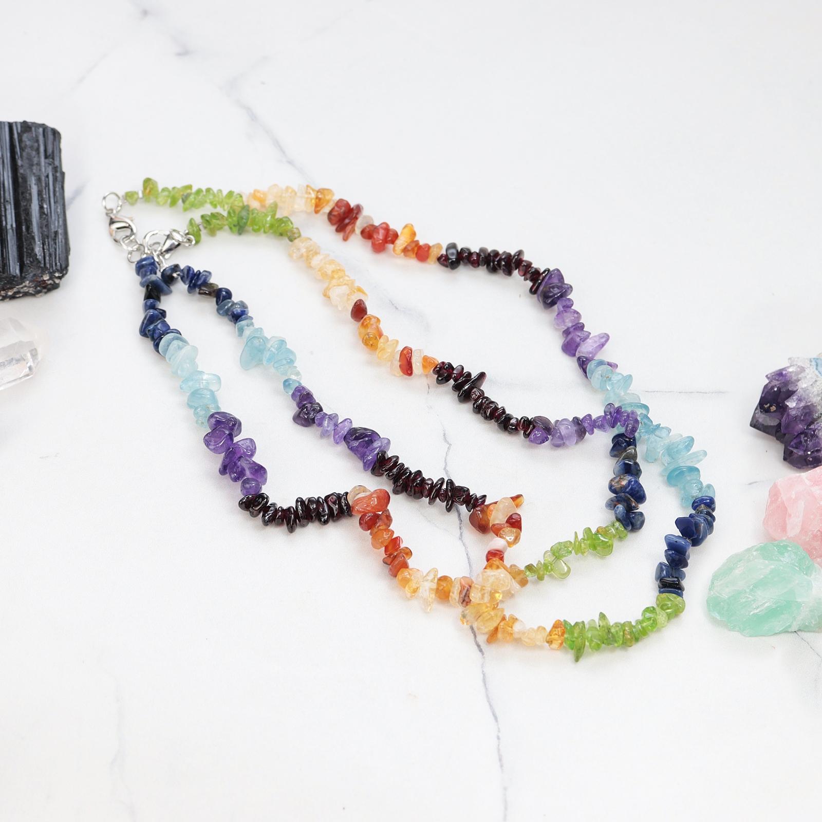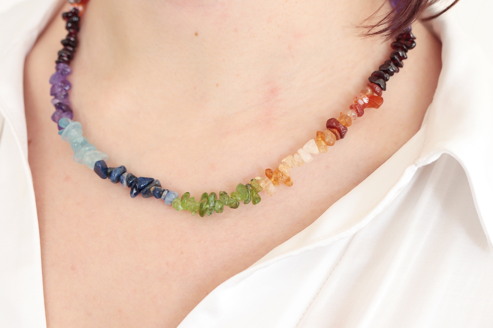 Naszyjnik 7 czakr na żyłce z metalowym zapięciem na karabińczyk. Wykonany z sieczki kryształowej, czyli drobnych, polerowanych kamyczków. Przybliżona długość wraz z zapięciem to ok. 45 cm. Do naszyjnika można dobrać pasującą kryształową bransoletkę, tworząc harmonijny zestaw.