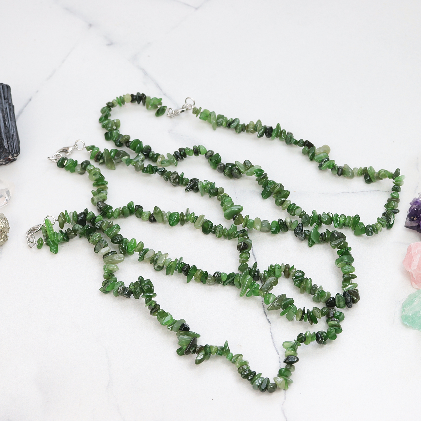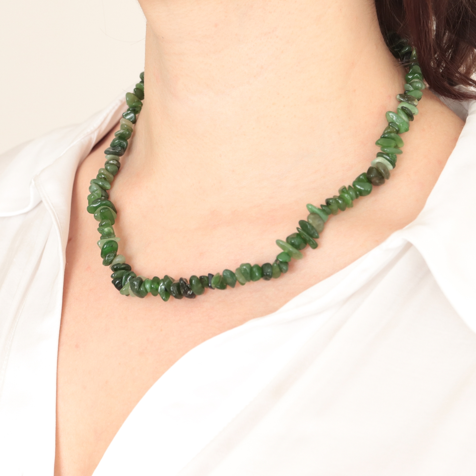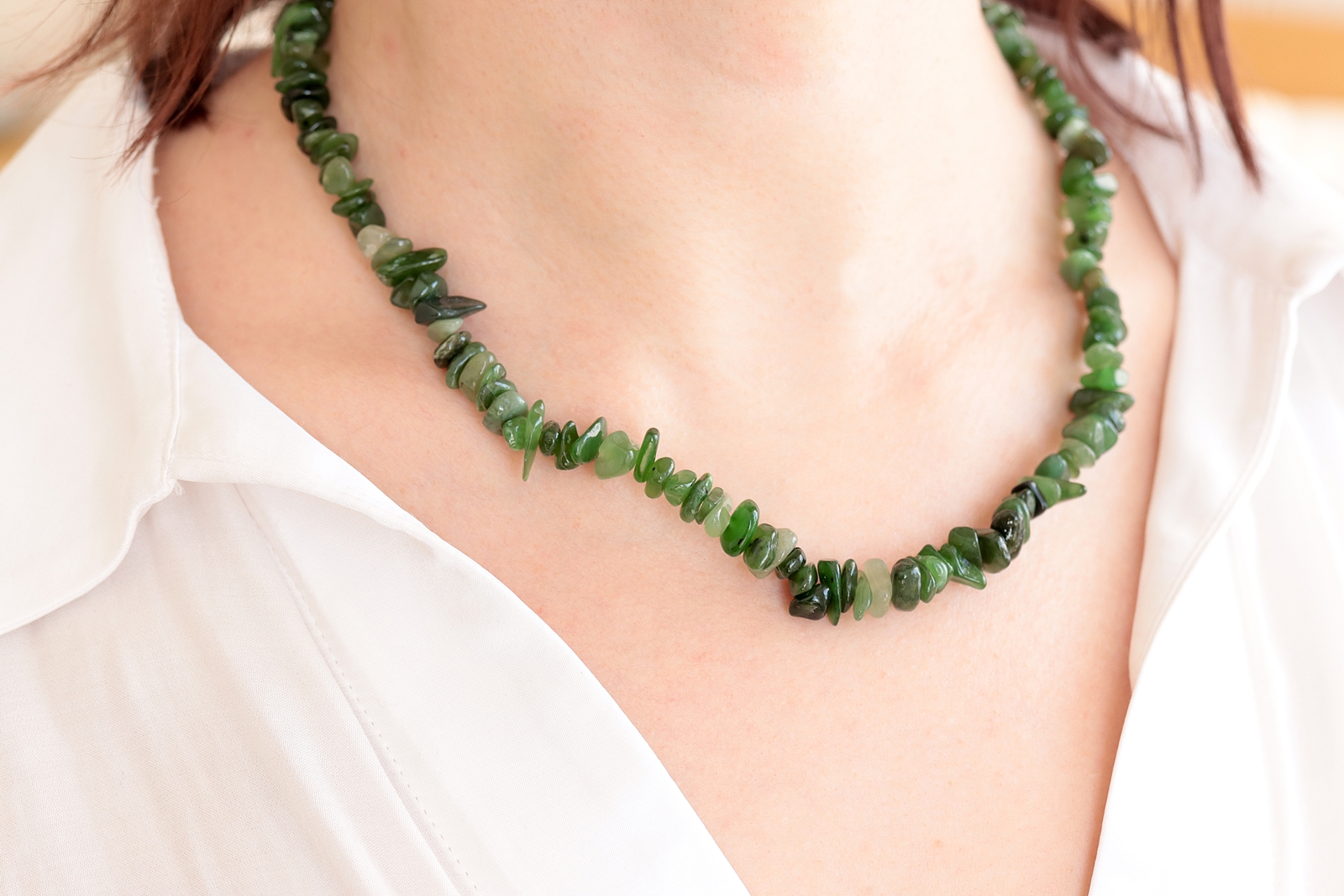 Naszyjnik z naturalnego nefrytu na żyłce z metalowym zapięciem na karabińczyk. Wykonany z sieczki kryształowej, czyli drobnych, polerowanych kamyczków. Przybliżona długość wraz z zapięciem to ok. 45 cm. Do naszyjnika można dobrać pasującą kryształową bransoletkę, tworząc harmonijny zestaw.