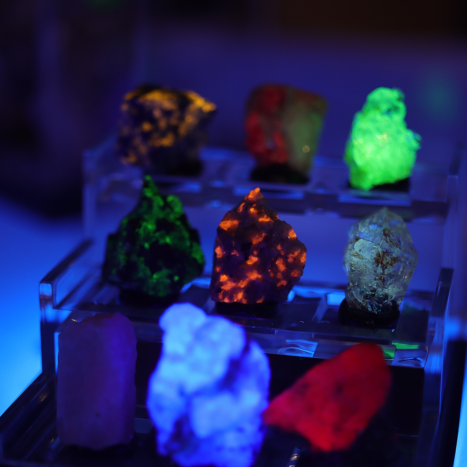 Pod wpływem promieniowania UV minerały w spektakularny sposób rozświetlają się intensywnymi kolorami – od neonowych zieleni, po głębokie róże i jasne błękity. Każdy zestaw jest unikalny i tworzy hipnotyzującą, magiczną ekspozycję.