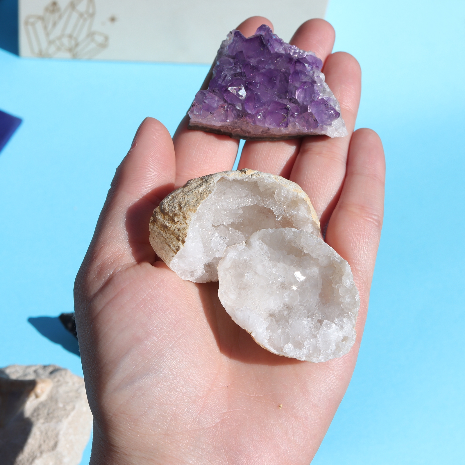 Z zewnątrz wygląda jak zwykły kamień, ale w środku kryje prawdziwy skarb – połyskujące kryształy! To jak otwieranie magicznego jajka.
