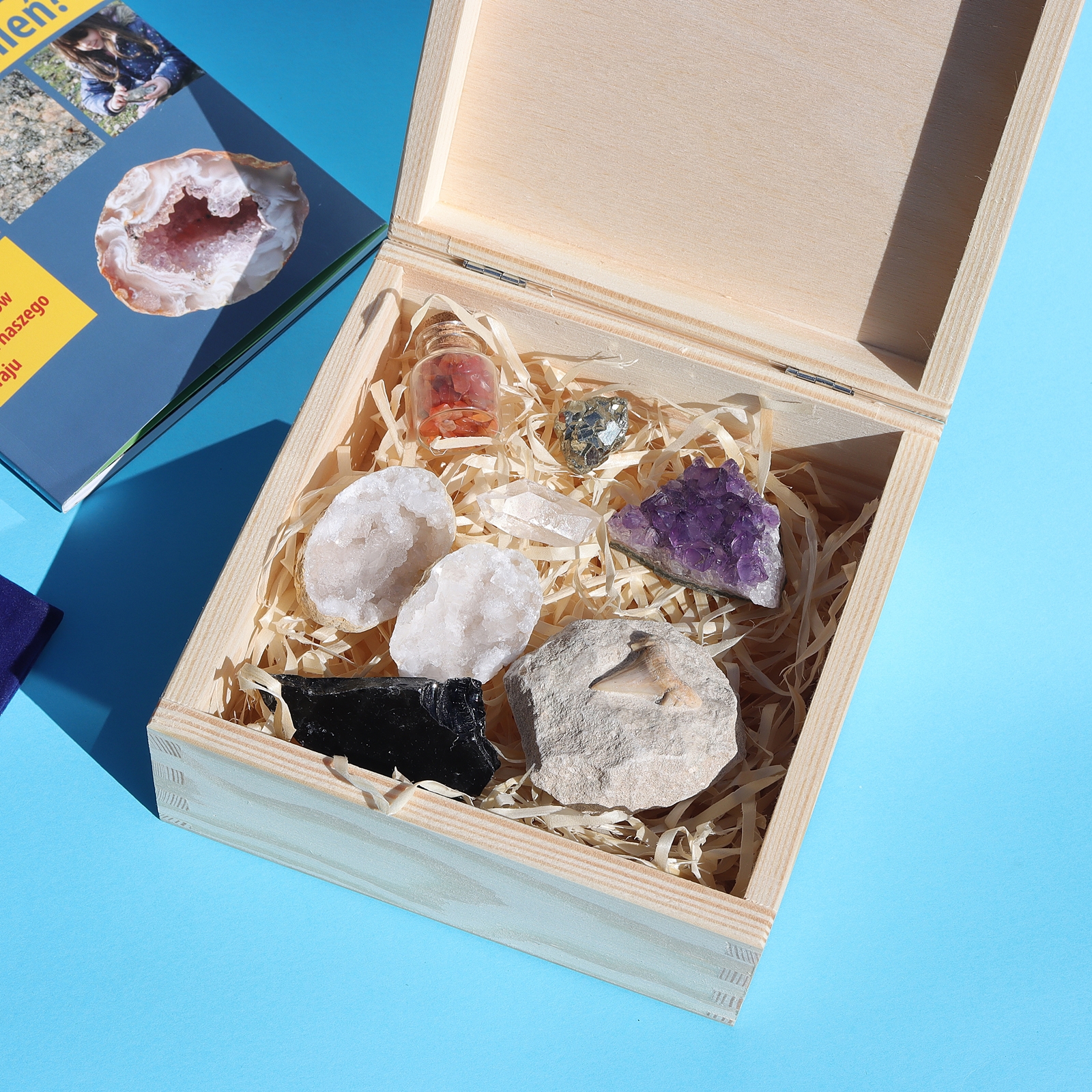 Zamień ciekawość w przygodę z wyjątkowym zestawem minerałów i skamieniałości, stworzonym specjalnie dla dzieci! W eleganckim pudełku czekają prawdziwe skarby natury: