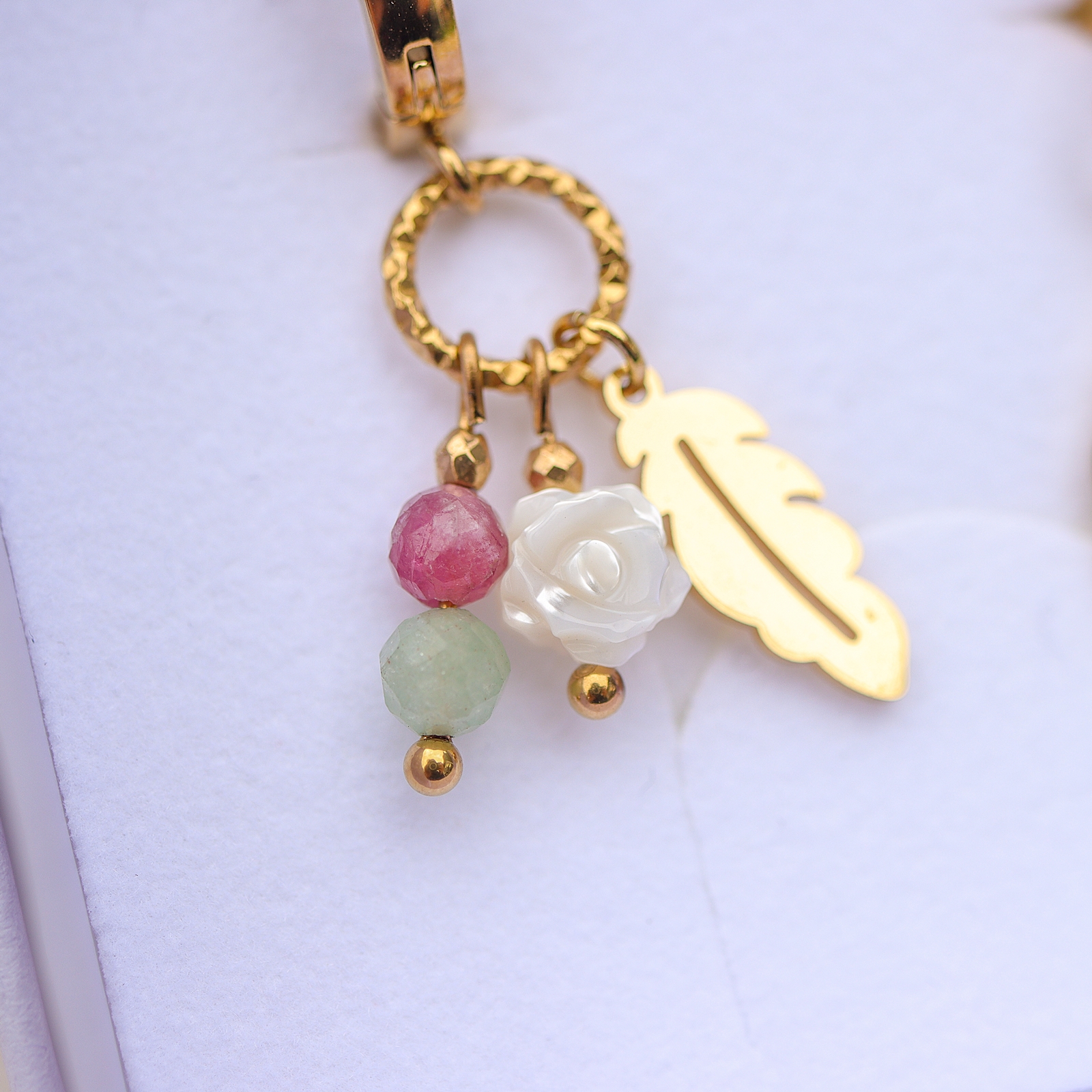 ? Materiały: stal chirurgiczna pozłacana, różowy turmalin, zielony awenturyn, masa perłowa (ręcznie rzeźbiona róża)