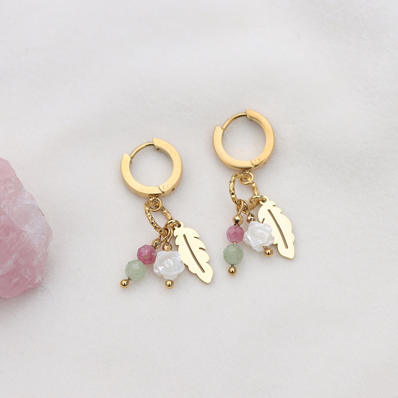 Złote kolczyki z różą, turmalinem i awenturynem | Stal chirurgiczna, kamienie naturalne