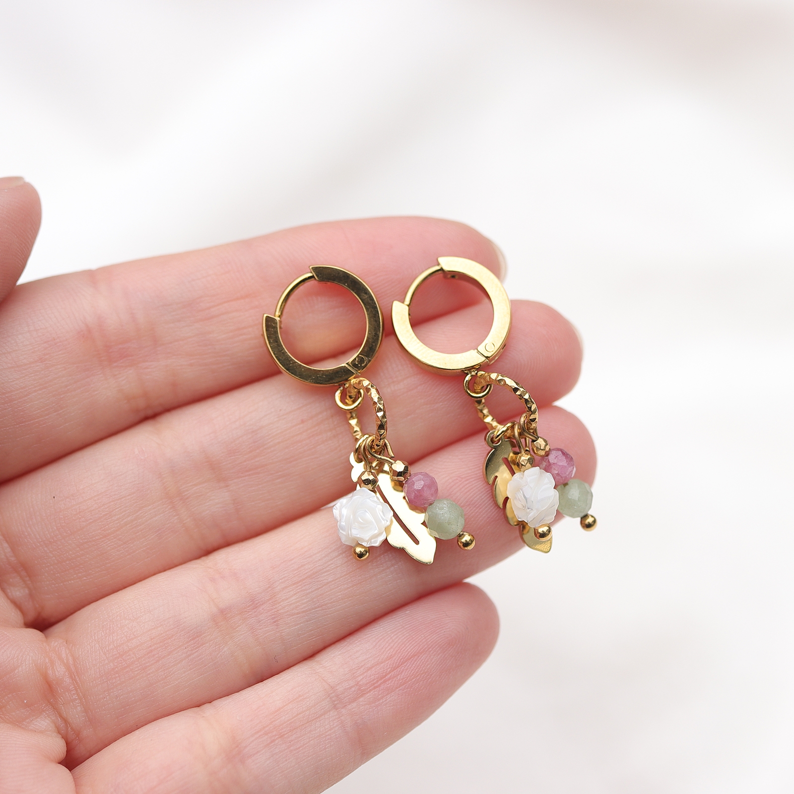 Zatrać się w romantycznym detalu dzięki naszym ręcznie wykonanym kolczykom z naturalnymi kamieniami i pięknie rzeźbioną różą z masy perłowej. Ten wyjątkowy model łączy delikatność i głębię – idealny dla kobiet, które cenią biżuterię z duszą.